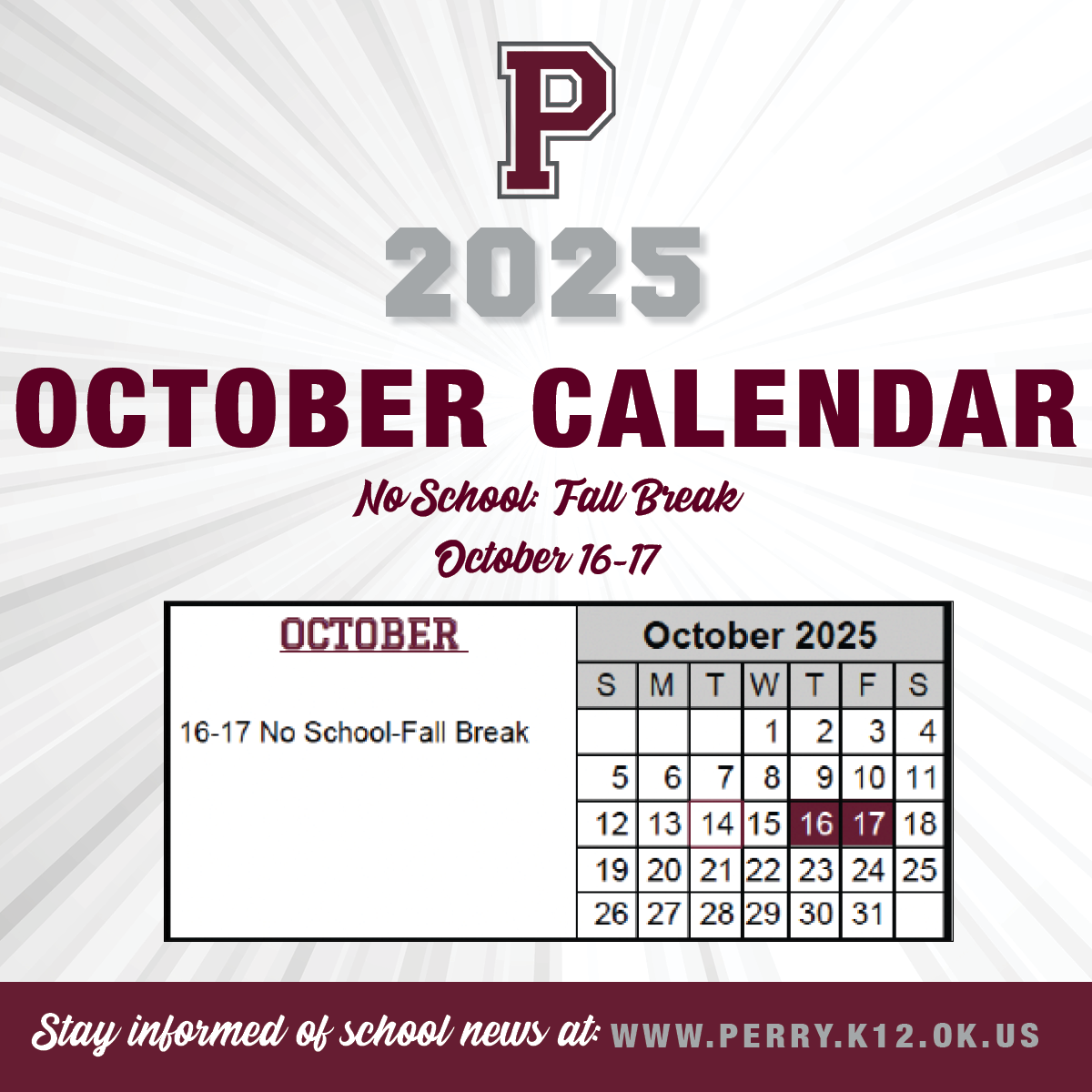 OCTOBER CALENDAR View the full district calendar: www.perry.k12.ok.us/apps/pages/calendar Published October 1, 2025 Print