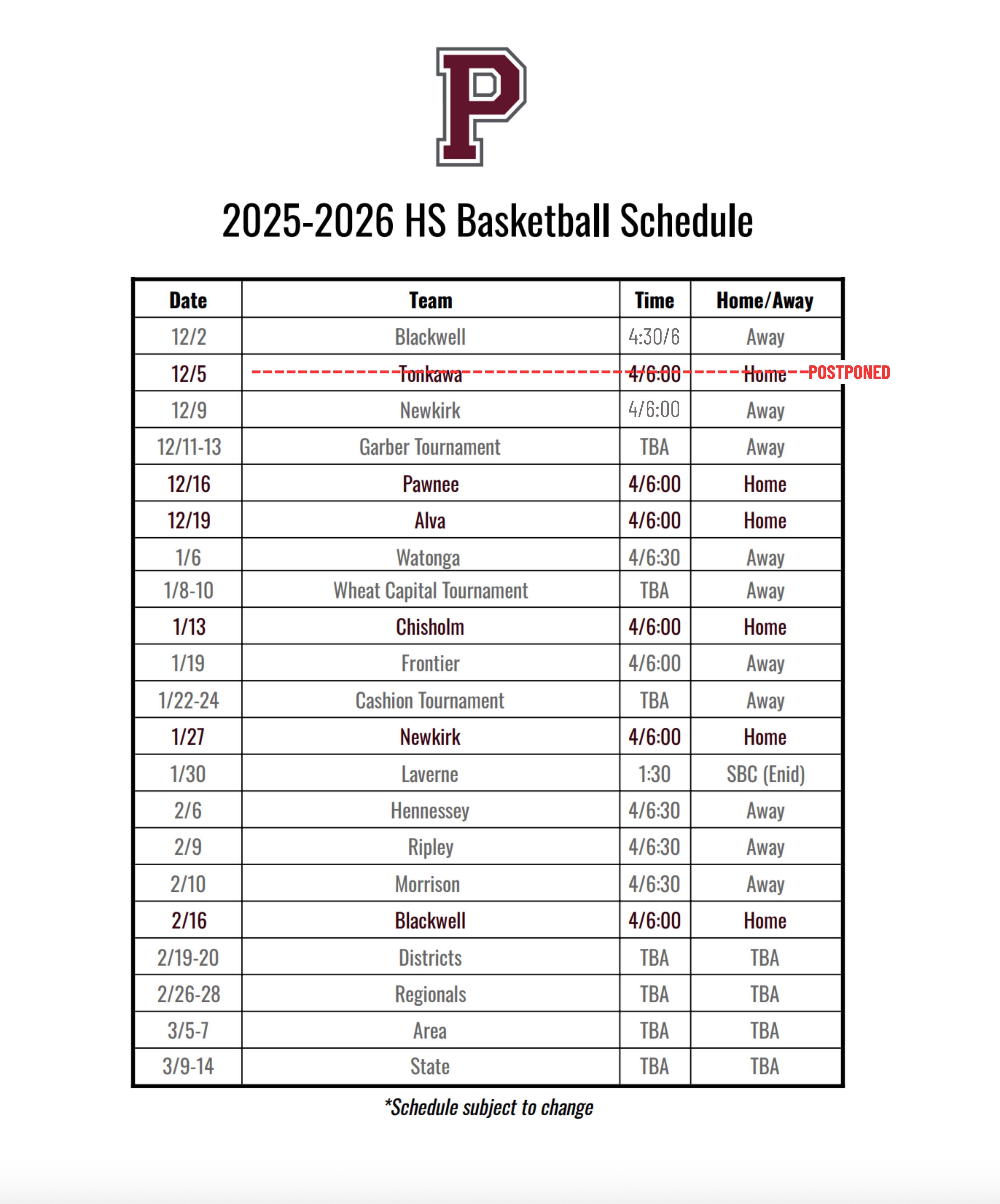 HS BASKETBALL SEASON 25-26 https://www.perry.k12.ok.us/apps/pages/Basketball Updated schedule as of 12/1/25. Attached Files Basketball schedule update 25-26.pdf Published December 1, 2025 Print