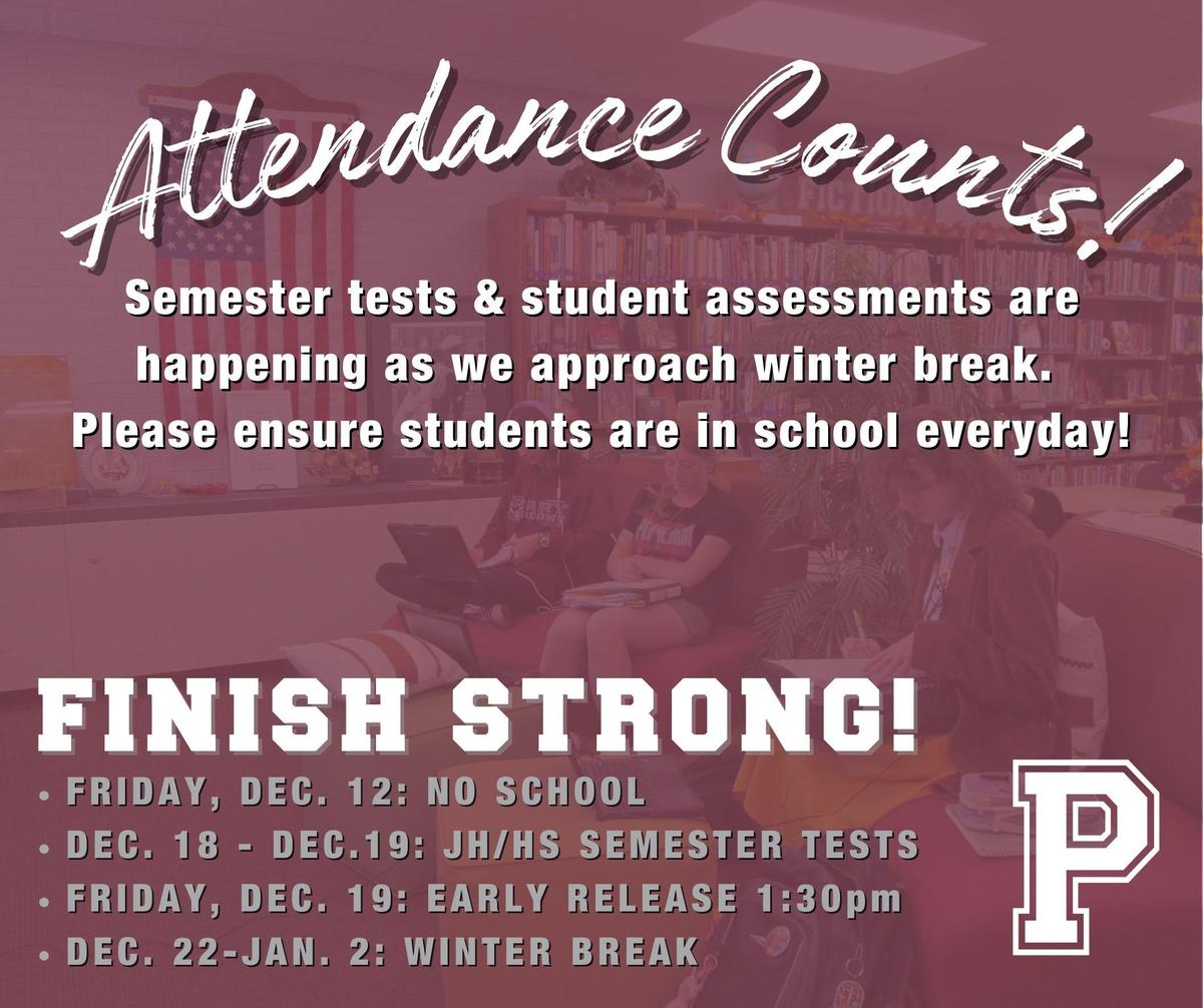 ATTENDANCE - FINISH STRONG! 2025 December Reminders: FRIDAY, DEC. 12: NO SCHOOL DEC. 18-DEC. 19: JH/HS SEMESTER TESTS FRIDAY, DEC. 19: EARLY RELEASE 1:30pm DEC. 22-JAN. 2: WINTER BREAK Review attendance policies & info here: www.perry.k12.ok.us/apps/pages/attendance Published December 3, 2025 Print