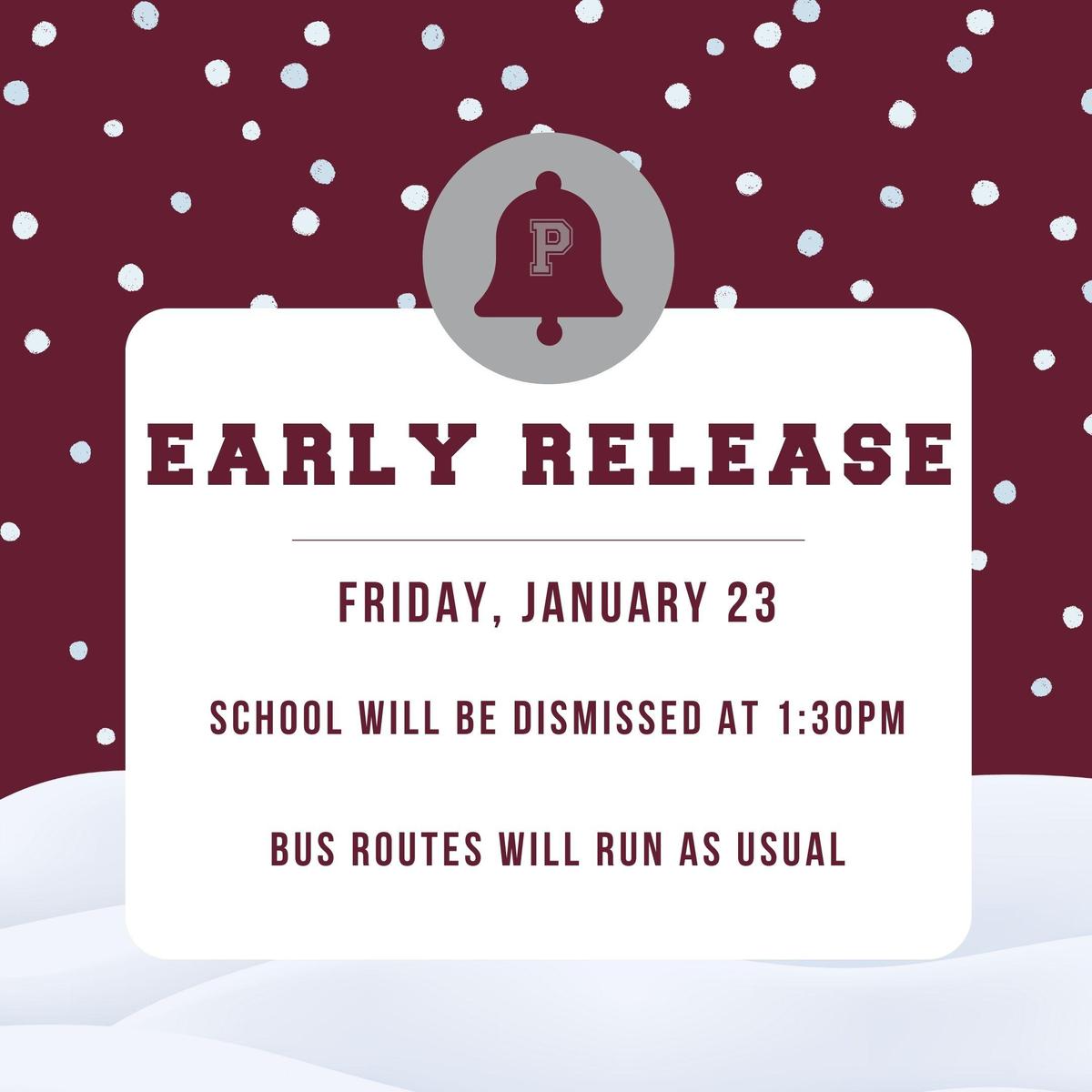 Based on the latest update from the National Weather Service, the winter storm is expected to arrive in our area between 1pm-5pm, tomorrow, January 23rd. In preparation, Perry Public Schools will be dismissed at 1:30pm tomorrow. Afternoon bus routes will begin running as usual at 1:30pm.