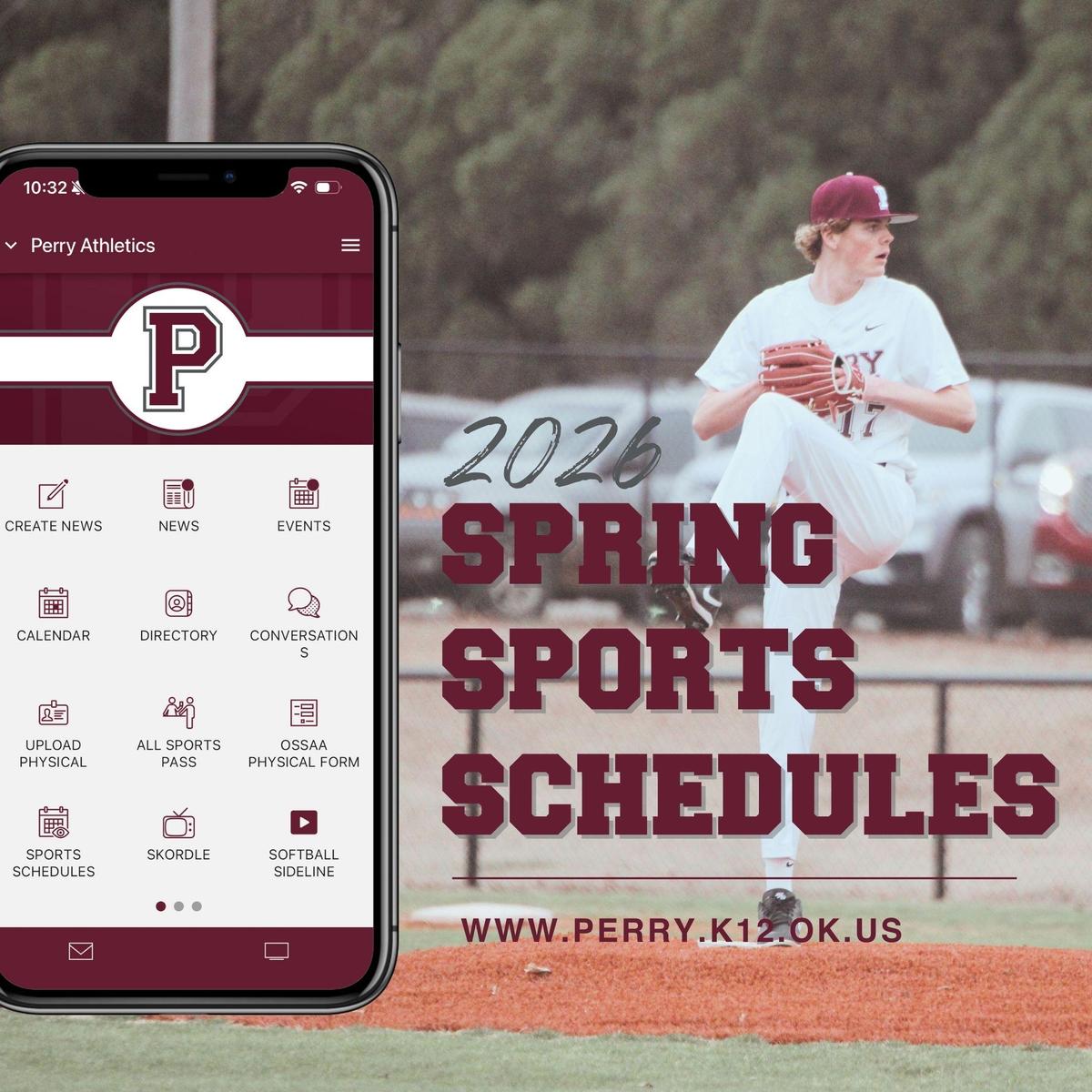 PHS/PJH SPRING SPORTS SCHEDULES RELEASED Perry Baseball, Golf, and Track schedules have been released for Spring 2026 sports. View them here: https://www.perry.k12.ok.us/apps/pages/athleticschedules Published February 6, 2026 Print