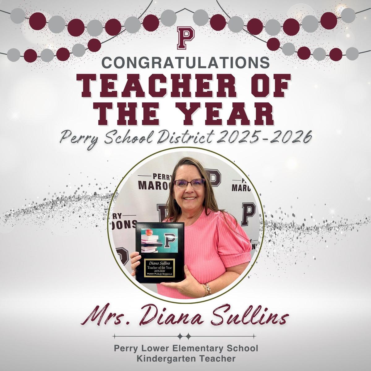 The highlight of the event came with the announcement of the Perry Public Schools District Teacher of the Year. Mrs. Diana Sullins received the distinguished honor and was recognized for her exceptional dedication to education. She was presented with a gift basket and pin from Exchange Bank, a plaque from First Bank & Trust, as well as a bouquet of flowers and professional development funds from the school district.